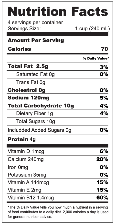 Water, Quinoa, Plant-Based Protein, High Oleic, Sunflower Oil, Calcium Carbonate, Vitamins A, D2, E, B12, Salt, Sunflower Lecithin, Gellan Gum, Vanilla Flavoring.